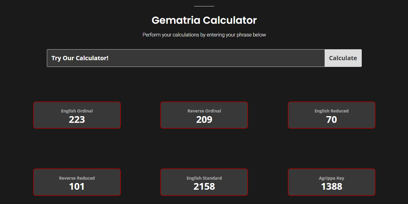 Welcome to a place where words reveal their deepest secrets. Our Gematria Calculator is your key to unlocking the hidden meanings encoded in language, an ancient practice that assigns a unique numerical value to every letter. Use this tool to explore the mystical connections and surprising synchronicities between names, ideas, and concepts.